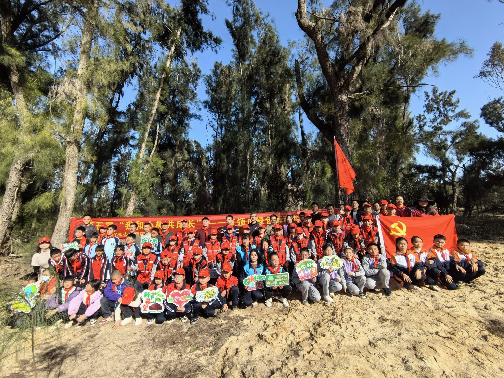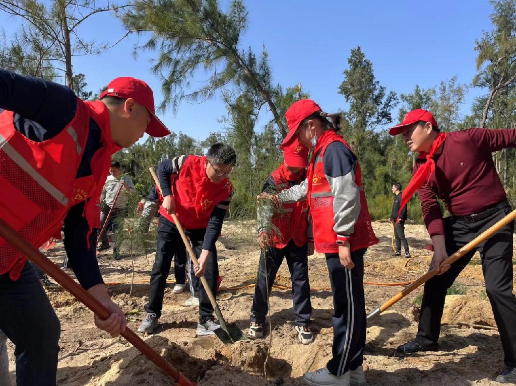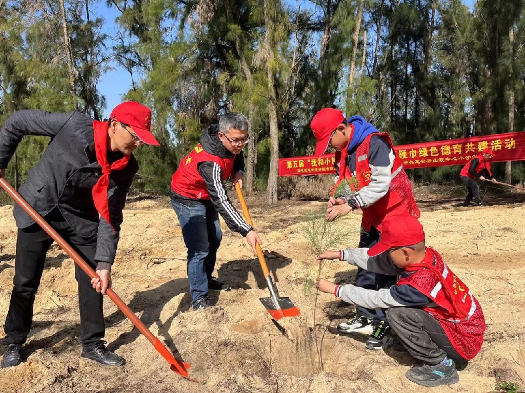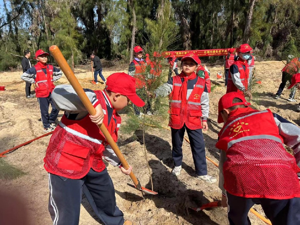 温和的阳光,满园的春色,值此青绿,种下新的希望。活动伊始,山霞中心小学的少先队员们为林场工作人员敬献了红领巾。少先队员们和林场志愿者满怀热情,挥锹挖穴、踏土夯苗、提水浇灌、配合默契、干劲十足、繁忙有序,300多株新栽植的木麻黄迎风摇曳、昂然挺立,展现出勃勃生机,形成一道靓丽的风景线。
