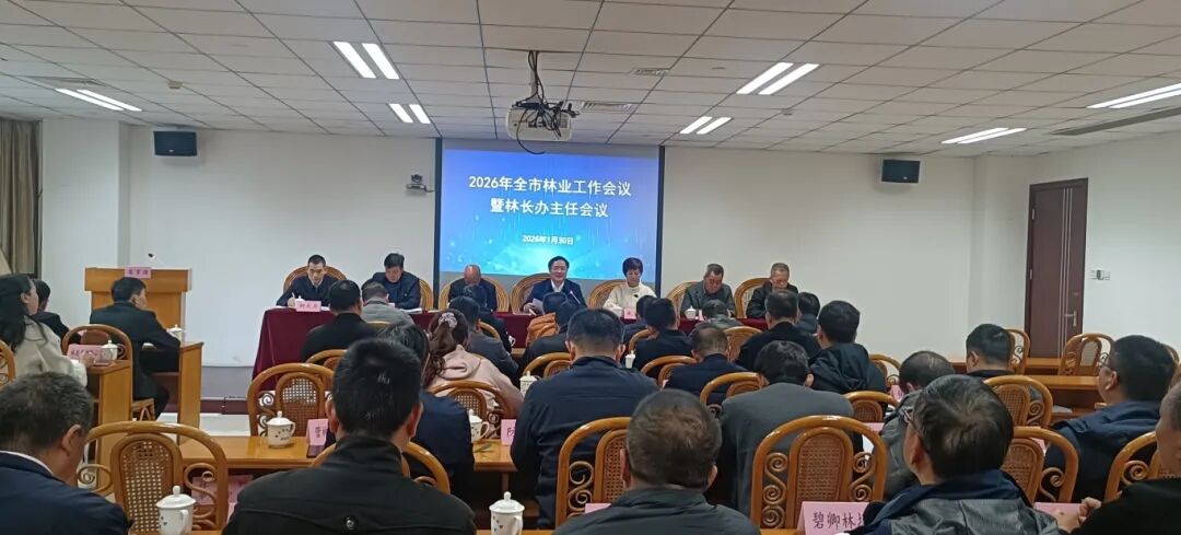 1月30日,全市林业工作会议暨林长办主任会议召开。会议深入学习贯彻中央和省委、市委经济工作会议、农村工作会议及全国林草工作会议、全省林业工作会议暨林长办主任会议精神,交流先进工作经验,总结2025年及“十四五”时期全市林业工作成效,部署2026年林业重点工作。市林业局党组书记、局长、市林长办主任郑进锡出席会议并讲话,市林业局党组成员、副局长黄玉真主持会议。